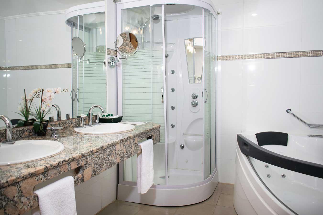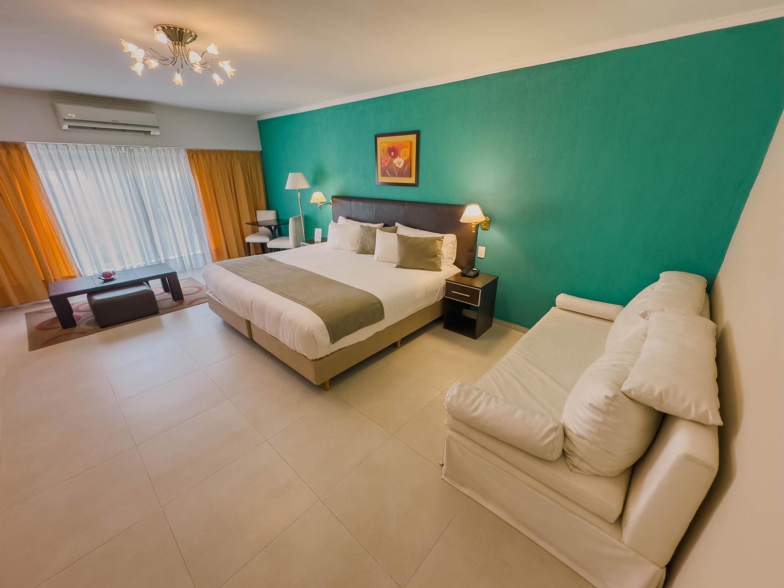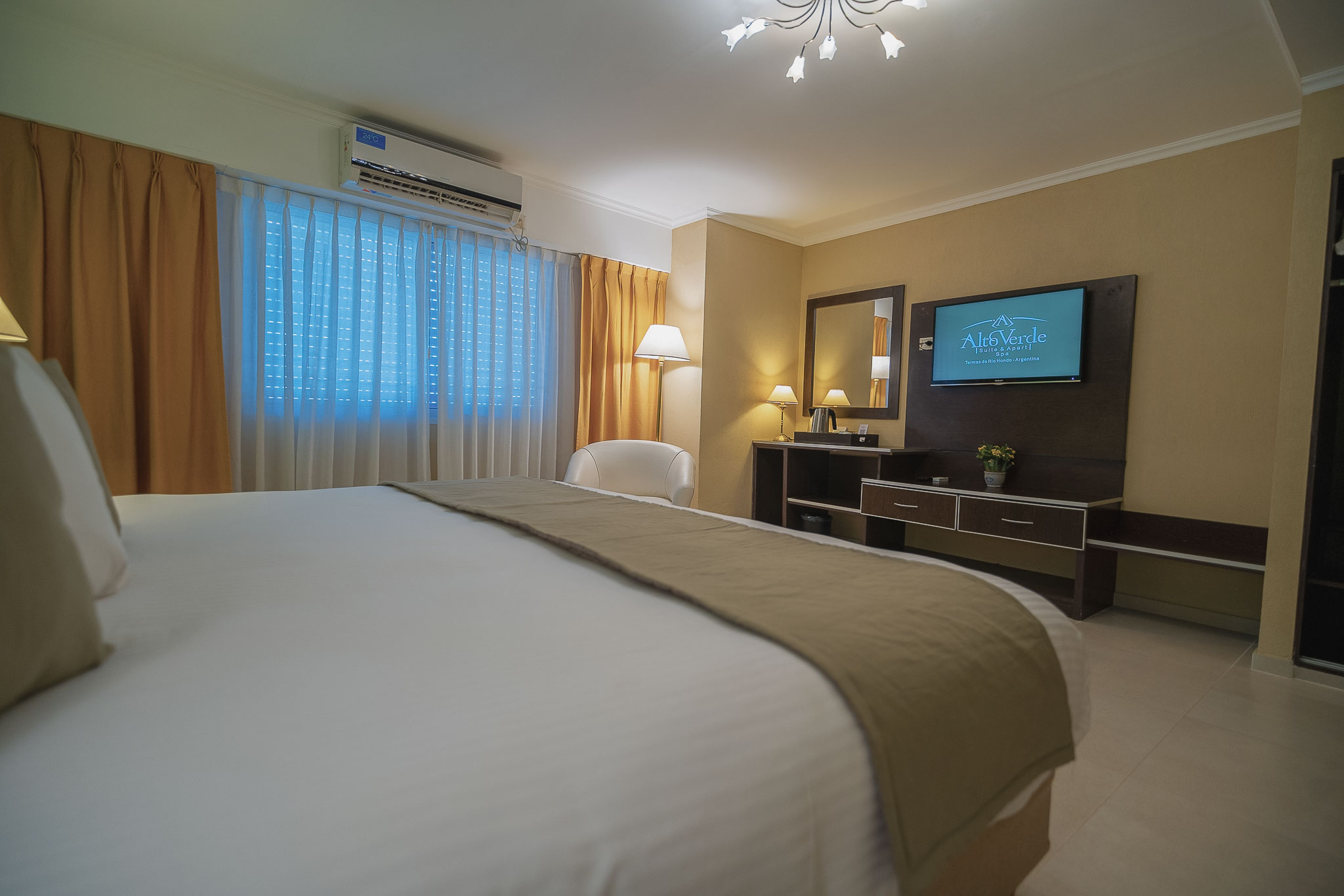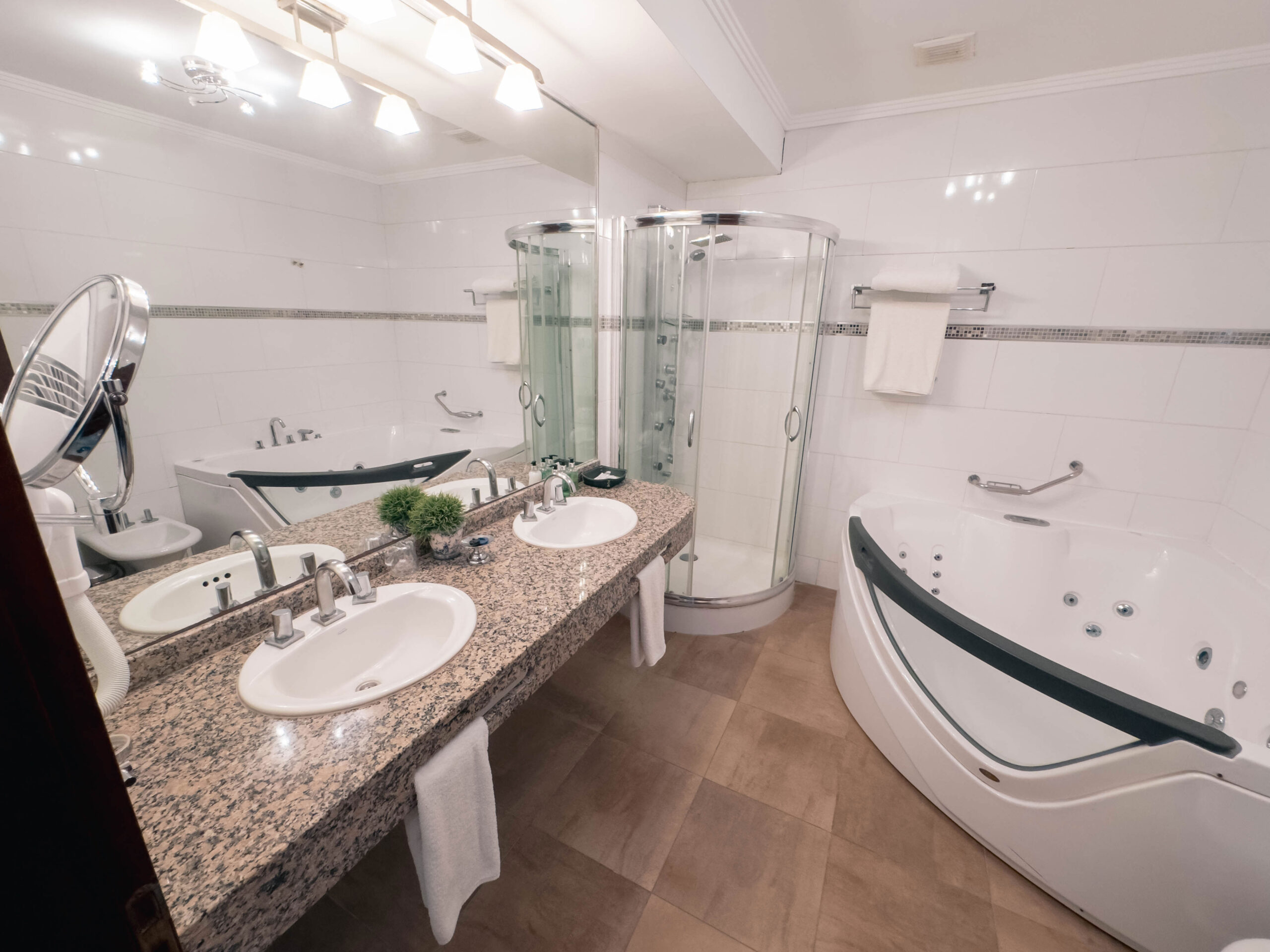 Sumergite en el confort y la exclusividad de nuestra Suite Premium. Disfrutá de un confortable living en un ambiente climatizado, perfecto para momentos de relax. La joya de esta suite es su amplio baño, equipado con un hidromasaje (minipiscina) de agua termal para dos personas y una revitalizante ducha escocesa en cabina de vidrio. Con camas Big King Size de 2 x 2.20 m, TV de 50 pulgadas con cable, amplio placard y frigobar con bebidas, cada detalle fue pensado para una experiencia de alta calidad y confort.